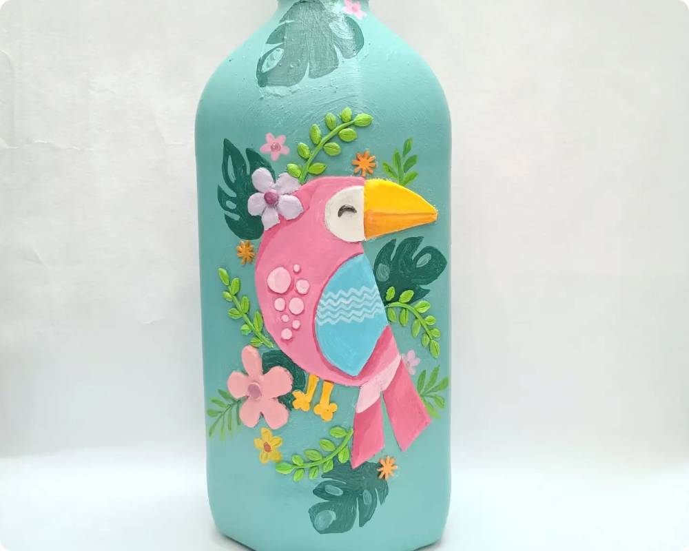 To make this clay art on bottle take dry clay and stick it on the body of the bottle. Draw and engrave this bird design on the bottle body with pink bird with green leaves, yellow beak and some flowers for decoration. Keep the art for drying and then colour it.