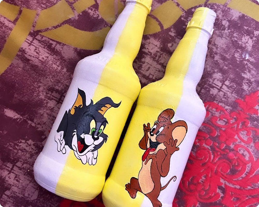 A Tom and Jerry painting on a bottle looks playful and full of charm, making it a fun piece of art. The bottle can be painted with a bright background, while Tom the cat and Jerry the mouse are shown in their classic mischievous poses. Tom might be chasing Jerry with his wide eyes and sneaky grin, while Jerry looks clever and cheeky, running away with a piece of cheese. The bold colours and cartoon style bring the bottle to life, turning it into a decorative piece that not only looks attractive but also reminds everyone of the timeless humour and friendship of the beloved cartoon.