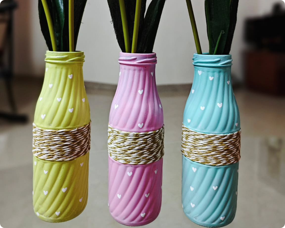 To make this, paint a empty glass bottle white and add heart and pink flowers on it. Tie some jute rope on the bottle mouth to change the appearance.