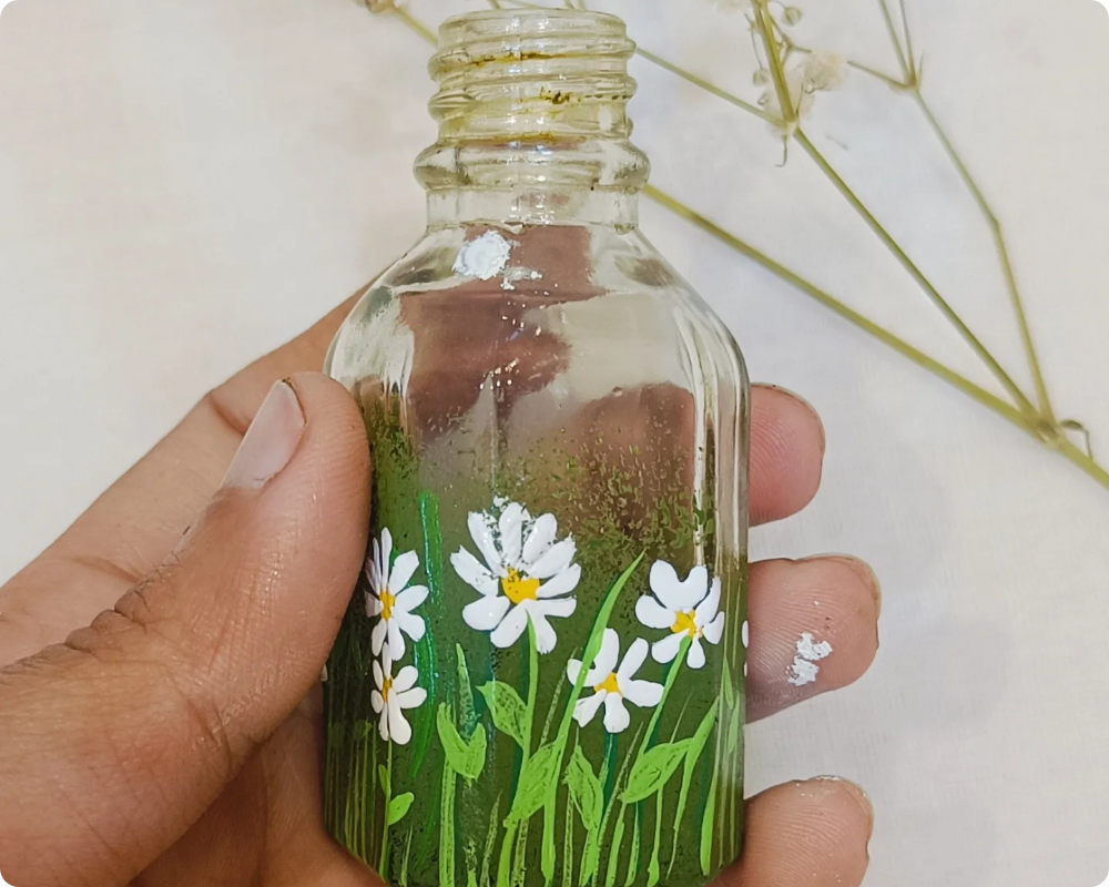 This is a small bottle art and to make this first spray some green colour on the edge of the bottle. Make white flowers and green leaves with green grass on it. Your bottle art is ready.