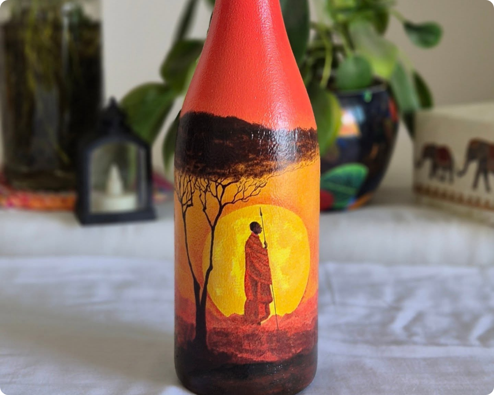 The artwork captures the silhouette of a person holding a spear, standing under a tree against the backdrop of a large, glowing yellow sun. The colors transition smoothly from deep red at the base to bright orange and yellow in the center, creating a warm and radiant effect. The blending of shades gives the painting a serene, almost magical atmosphere, reminiscent of an evening in the savanna. This decorative bottle is not only artistic but also adds a touch of nature-inspired elegance to any space.