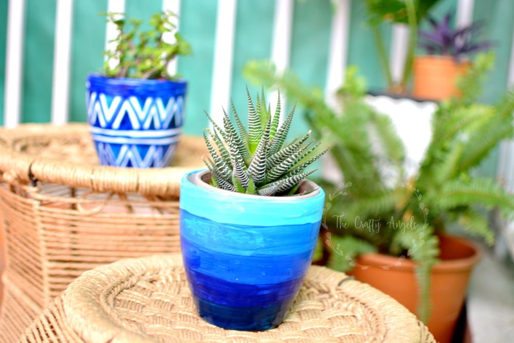 Add vibrant colors to your potted plants by painting their pots. It is advised to use acrylic paints to create beautiful designs and patterns that complement your plants.