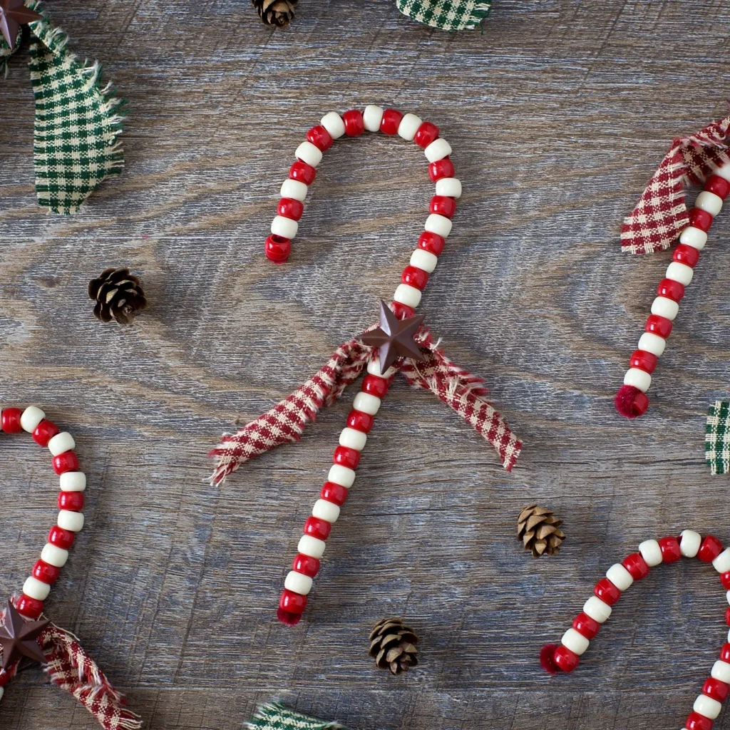 String red and white beads to make candy cane ornaments or cute keychains. This Christmas craft for kids enhances motor skills and hand-eye coordination among kids. It also helps them learn about symmetry.