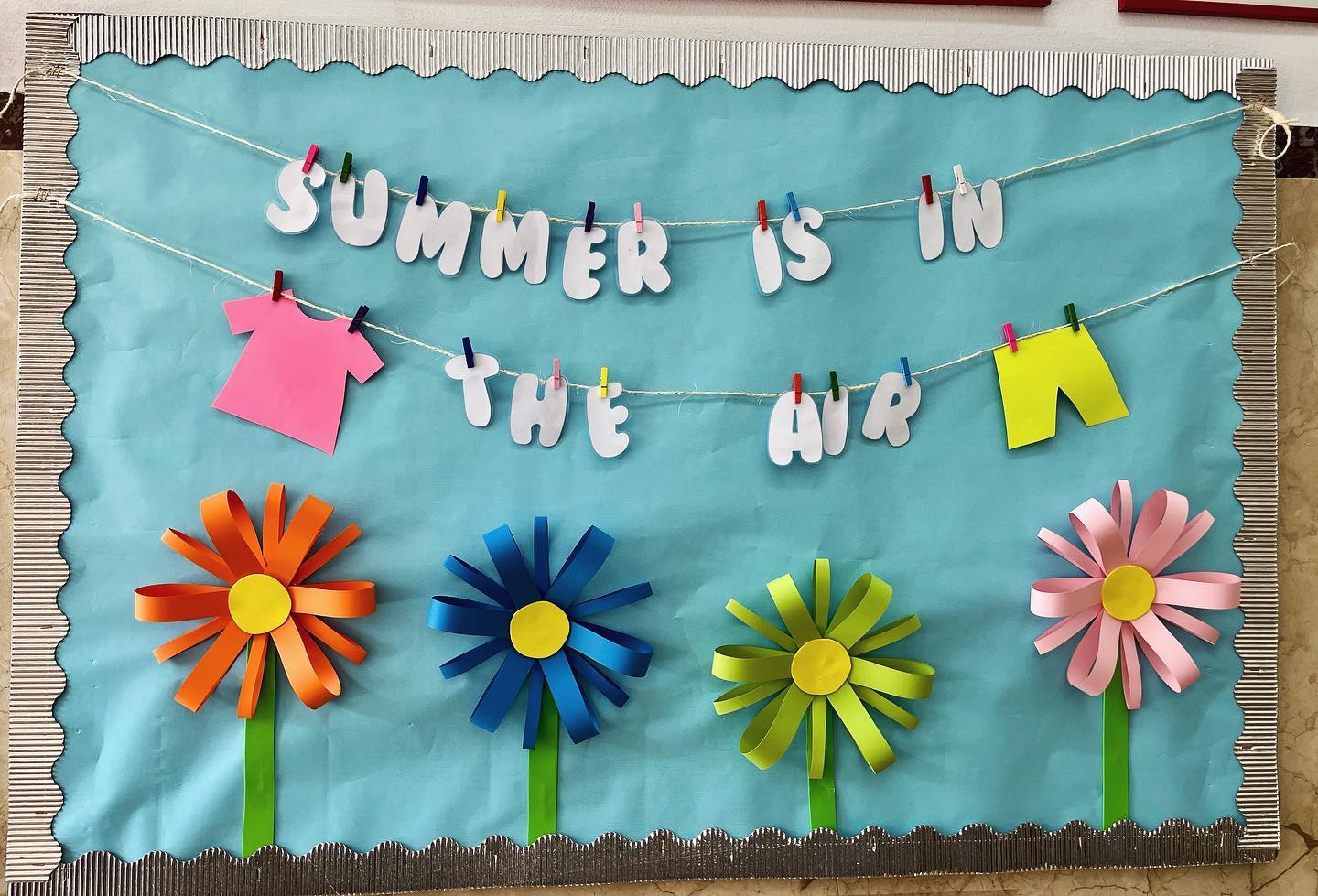Summer is almost here. To make a simple summer-themed school board cover there entire board with blue and then add some summer flowers, sun, bees, clothes hanging from rope and many more as shown in the above picture.
