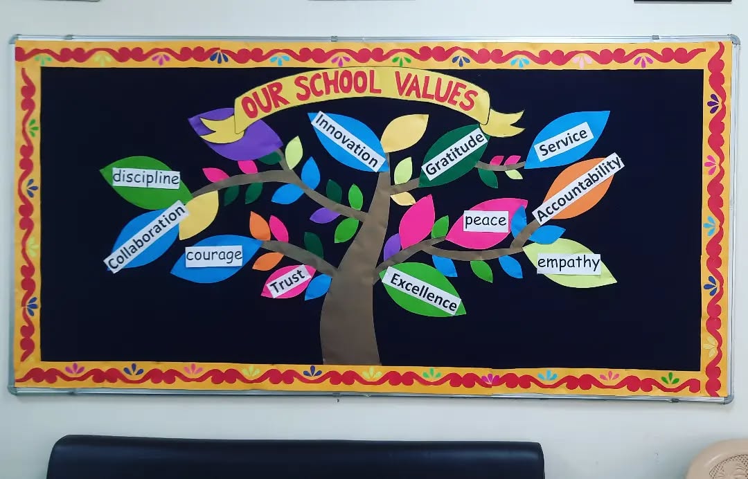 This school board teaches values to students. Create a tree with colourful leaves and add value words in the leaves as shown above.