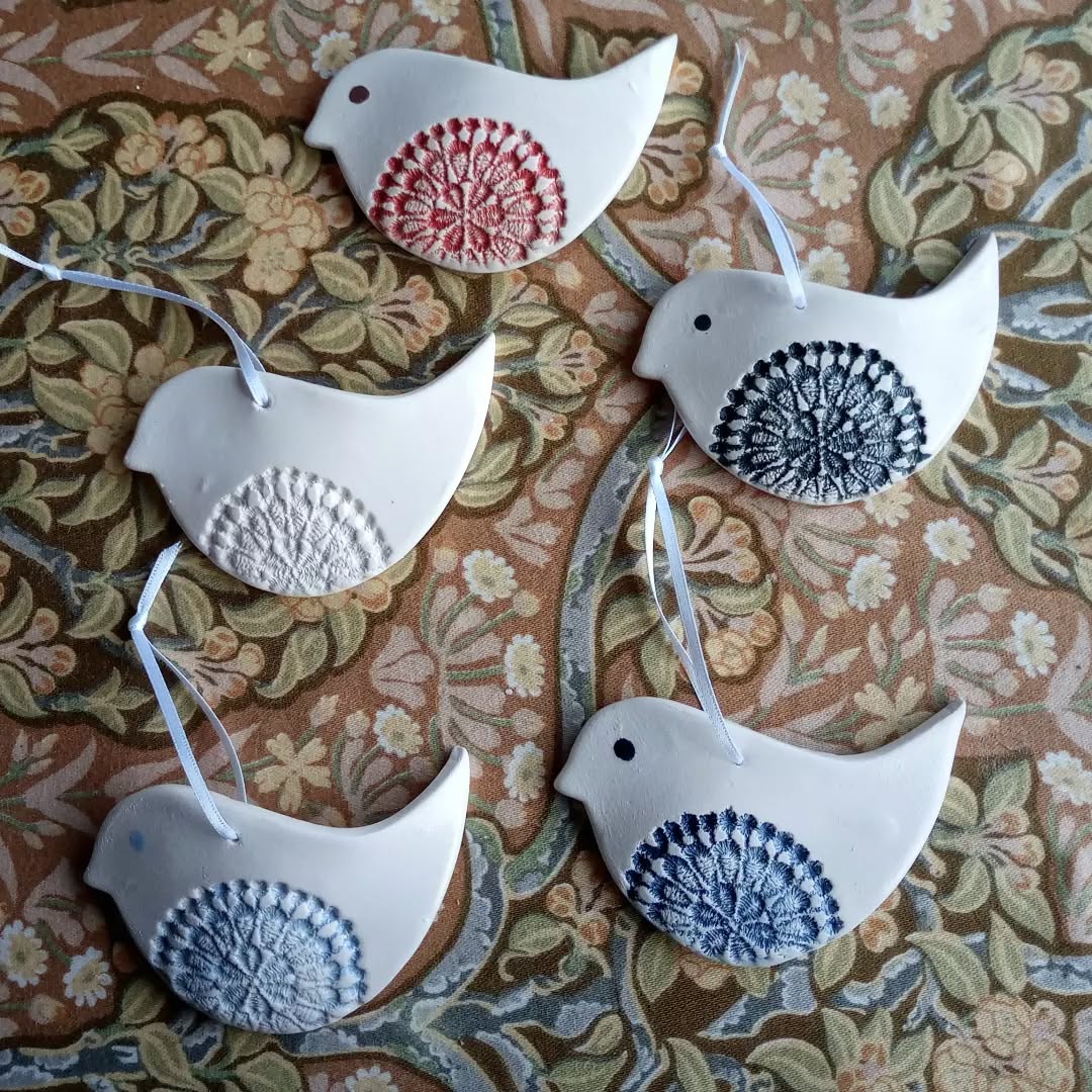 To make clay birds, flatten out a rolled clay and cut them into a piece of a bird. Use a toothpick to texture them and add colours.