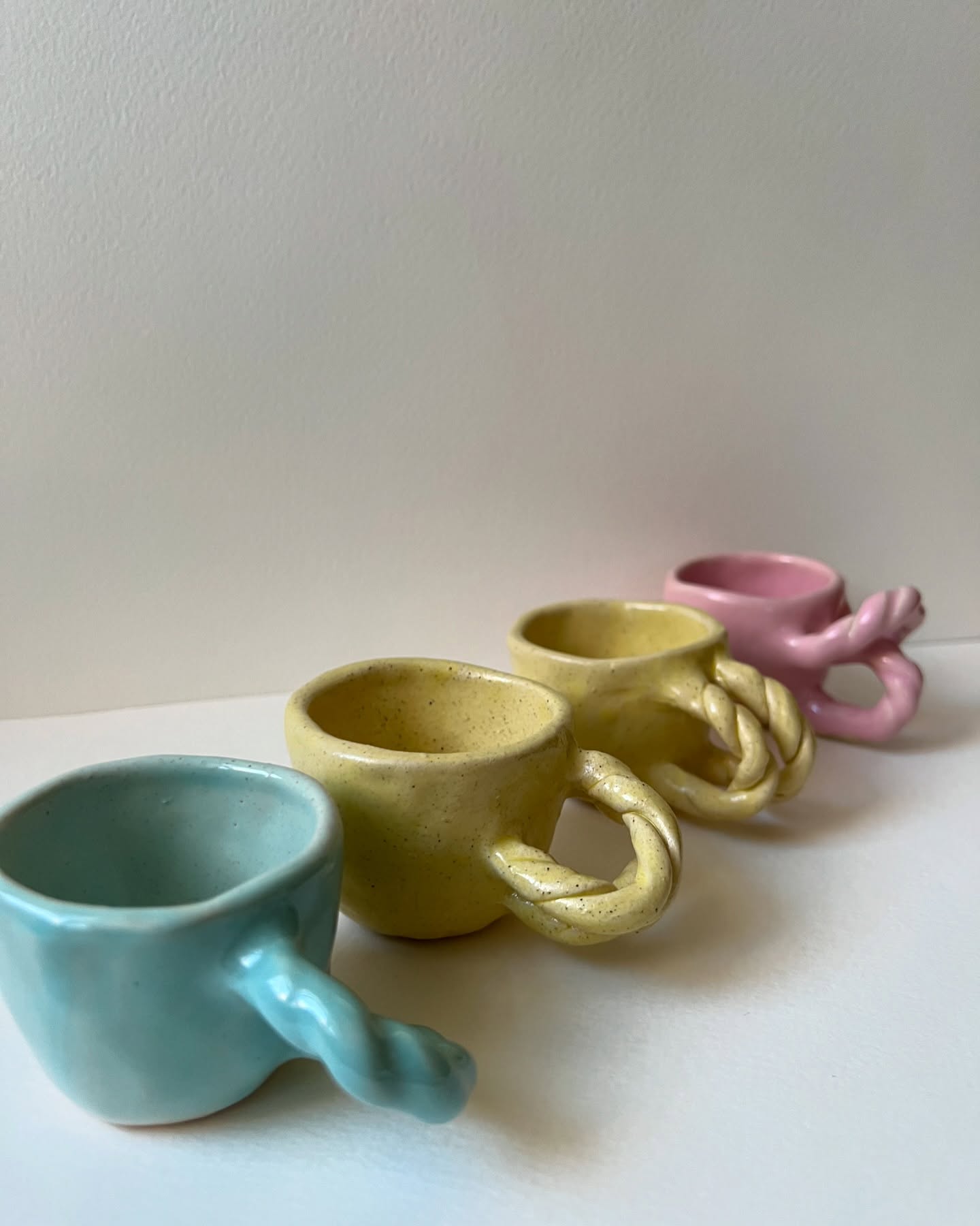 Roll a ball of clay almost about the size of a fist. Use your finger to press into the centre, creating a hollow. Pinch the sides outward while rotating, forming an even cup shape. Smooth the surface with the help of water and your fingers.