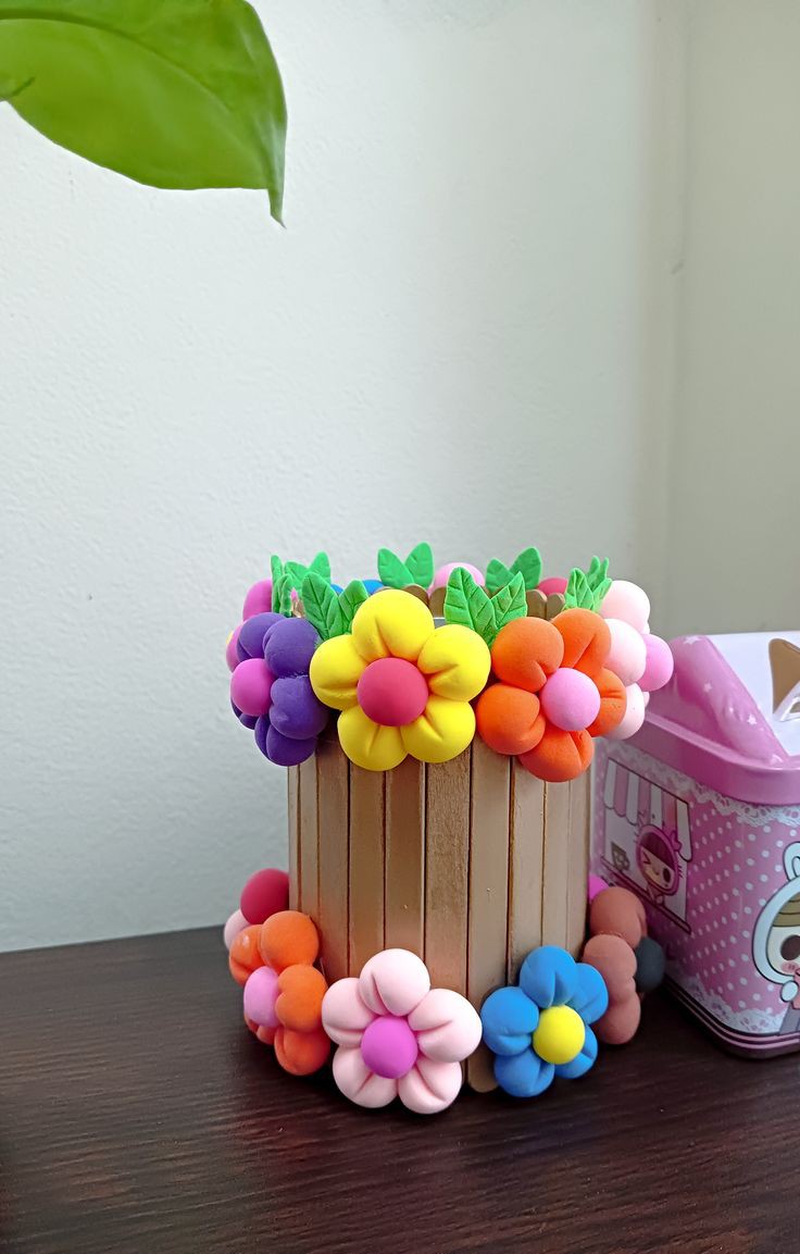 To make a clay pen holder, make small flowers and attach them to a cylindrical pen stand, or you can also make a pen standd by just following the steps of making a clay cup.