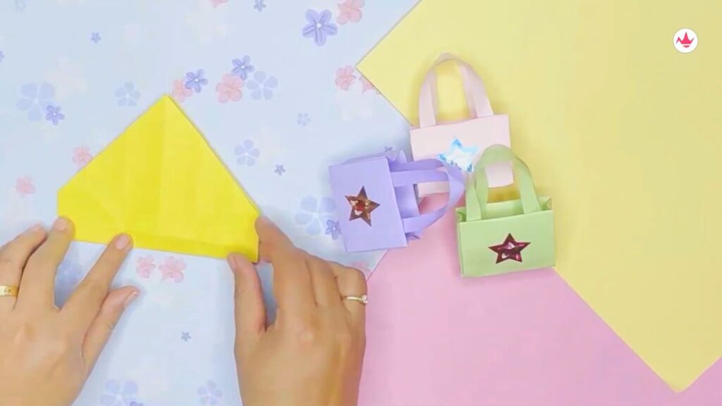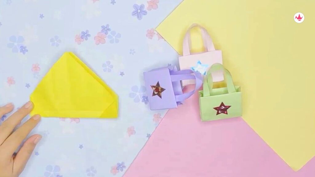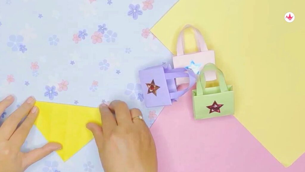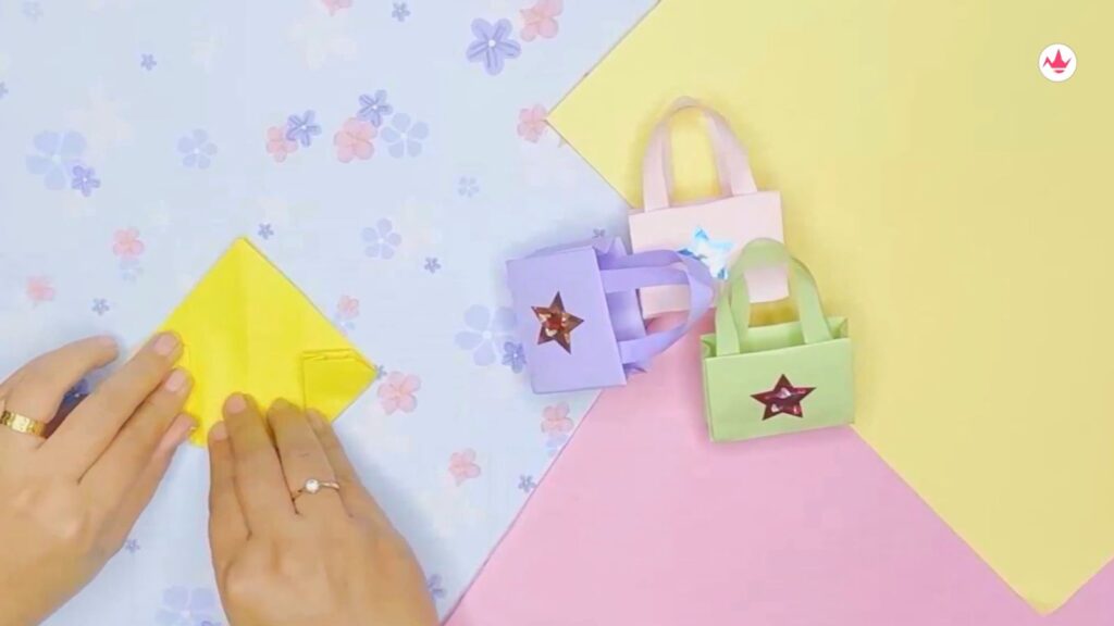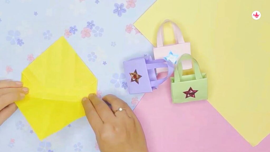 Start by taking a square sheet of origami paper. This is the easiest way to make a paper bag craft.