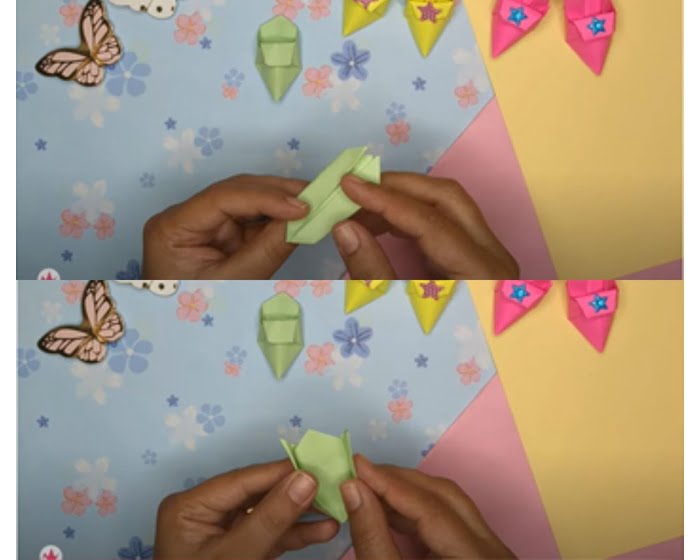 Fold the paper form the end to the center and make another fold on the same fold above. You will get a triangular fold shape of the craft paper.