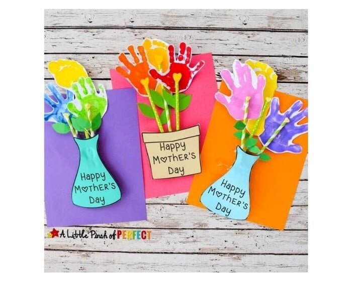 For a different spin on the Mother’s Day handprint craft idea, use paint. The flowers can be formed from hands and footprints, and the printable vases are a tremendous time saver. They are classic kids craft ideas for Mother’s Day with a fresh twist.