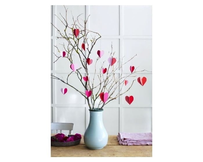 Fill a vase with backyard branches first, and then hang one-of-a-kind paper decorations fashioned from cardstock and thread from each branch to create this gorgeous heart-shaped paper centerpiece. On the hearts, one can also write nice reasons for loving Mom. Such an easy craft idea for kids on Mother’s Day.