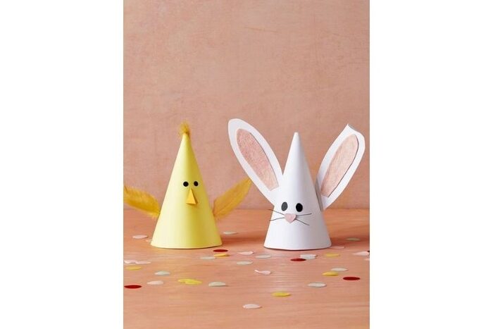 Everyone needs party hats since Mother’s Day is a celebration, right? Create the cones using craft paper and our party hat design. Next, add feathers for wings and floral wire for whiskers. Finally, create felt and paper rabbit ears. What a wonderful Mother’s Day craft idea for kids!