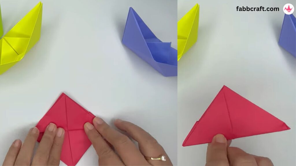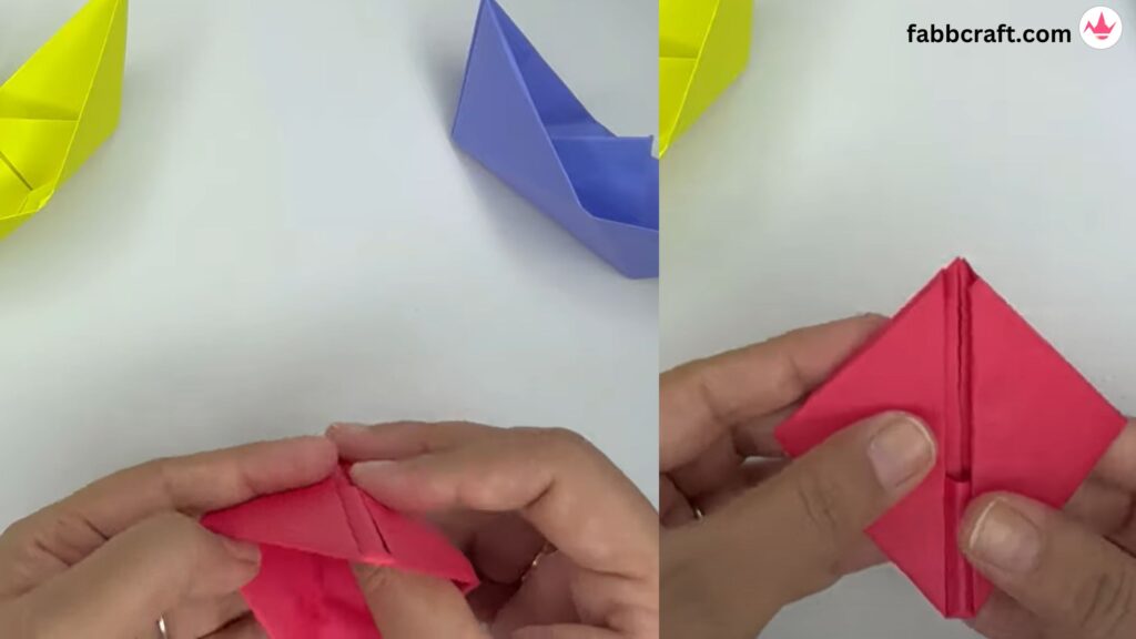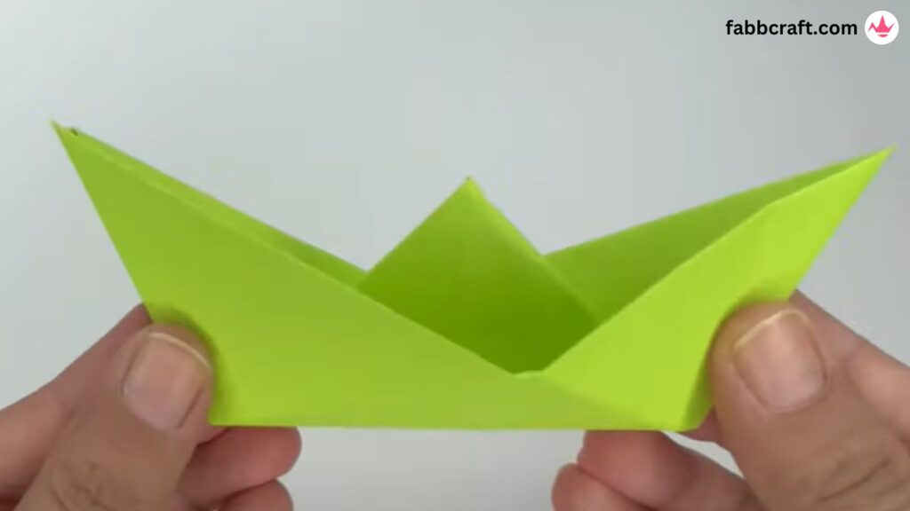 Separate the flaps on the left and right. Spread it out so that it resembles a boat. Let it open a little. The central triangle would look like a sail.