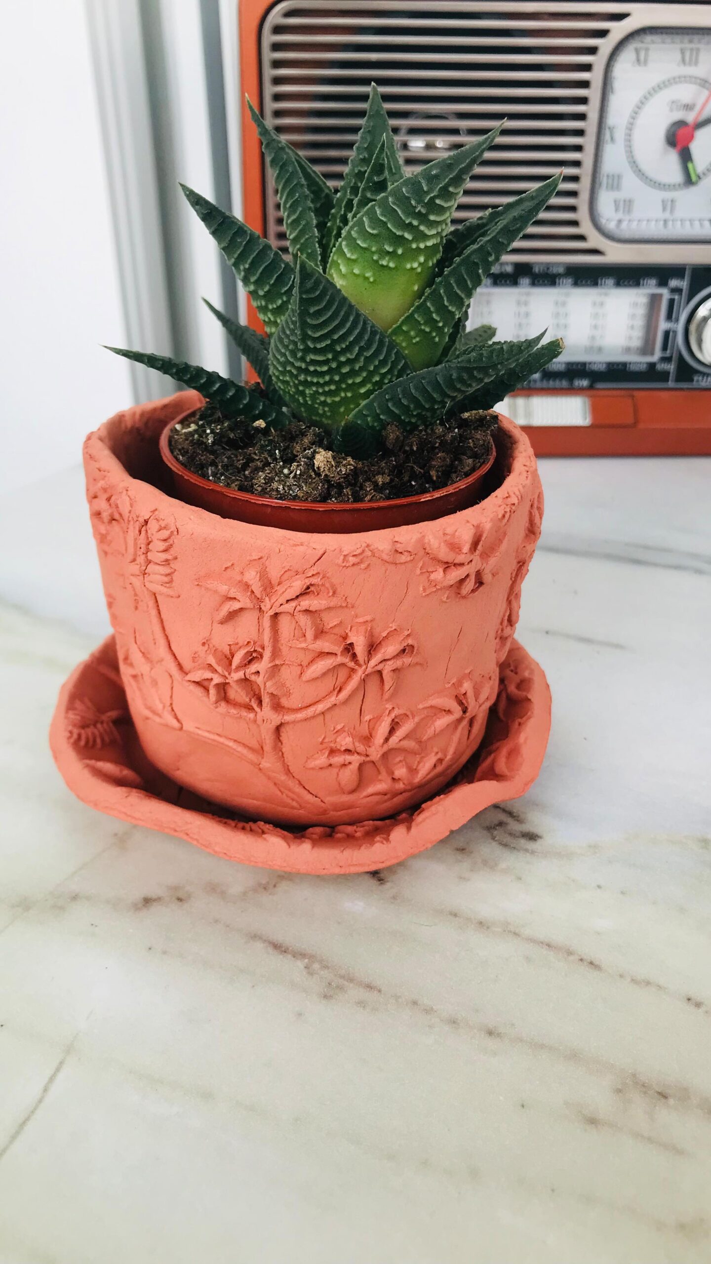 Start by rolling out your clay, then wrap a plant pot to create the shape. Carefully remove the shaker, then mould the clay around the pot. Now with your bare hand properly mould with and add textures to the clay pot be it a scenery tree or anything. Now, your handmade vase is ready to display!