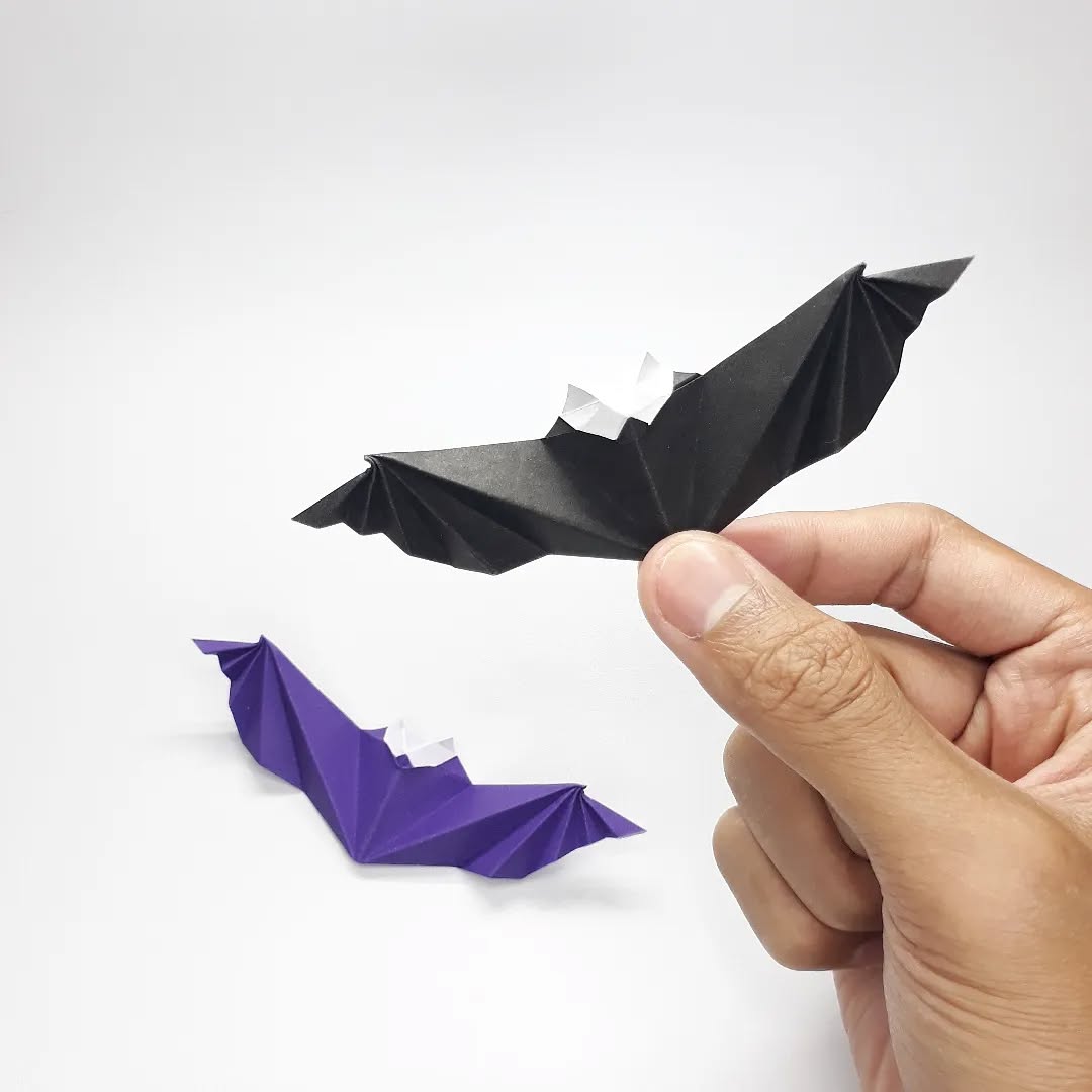 To make a paper bat, start with a square piece of black paper. First, fold the paper diagonally in both directions to create an “X” crease, then unfold it. Next, fold it in half horizontally and vertically to form additional creases. Collapse the paper along the creases into a triangle, known as a waterbomb base. Position the triangle with the pointed tip facing upward. Fold the bottom corners of the triangle upward at an angle to create the bat’s wings. Adjust the wings to give them a spread-out appearance. To form the head, fold the top tip of the triangle slightly downward, then fold two small triangles at the top to create ears. For a finishing touch, use a marker to draw eyes, a mouth, or fangs. Your paper bat is now complete and ready for decoration, making it perfect for Halloween or themed events!