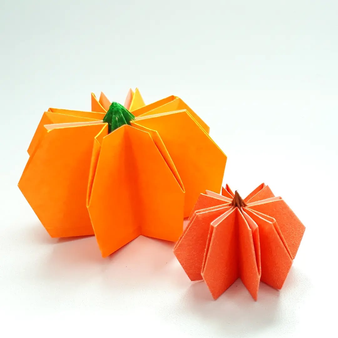 To create a paper pumpkin, begin with a square sheet of orange origami paper. Fold it in half horizontally and vertically to make creases, then unfold it. Next, bring each corner toward the centre to form a smaller square. Flip the paper over and repeat the process, folding the corners to the centre again. To achieve the classic round pumpkin shape, gently curve the edges by folding them slightly inward. For the stem, cut a small strip of green paper, roll it up, and attach it to the top using glue. You can also add green paper leaves or vines for extra decoration. If you want to make it a jack-o’-lantern, simply draw a fun or spooky face with a marker. This easy and festive paper pumpkin is ideal for Halloween decor, fall-themed crafts, or a creative seasonal project!