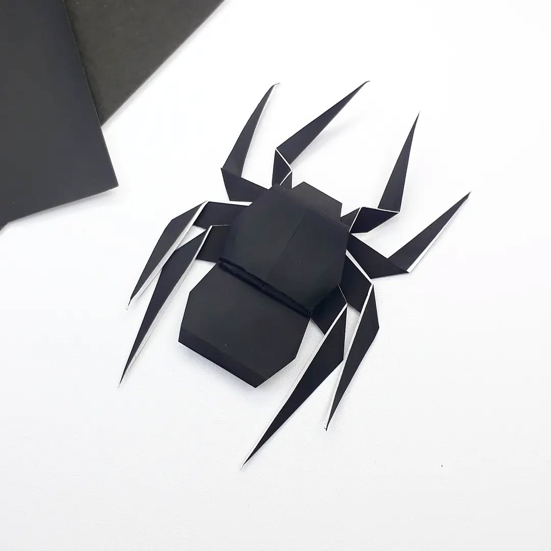 To make this cute spider fold one black paper in 4 parts one over the other for the body. For the 8 legs, you have to attach folded paper separately and your spider is ready.