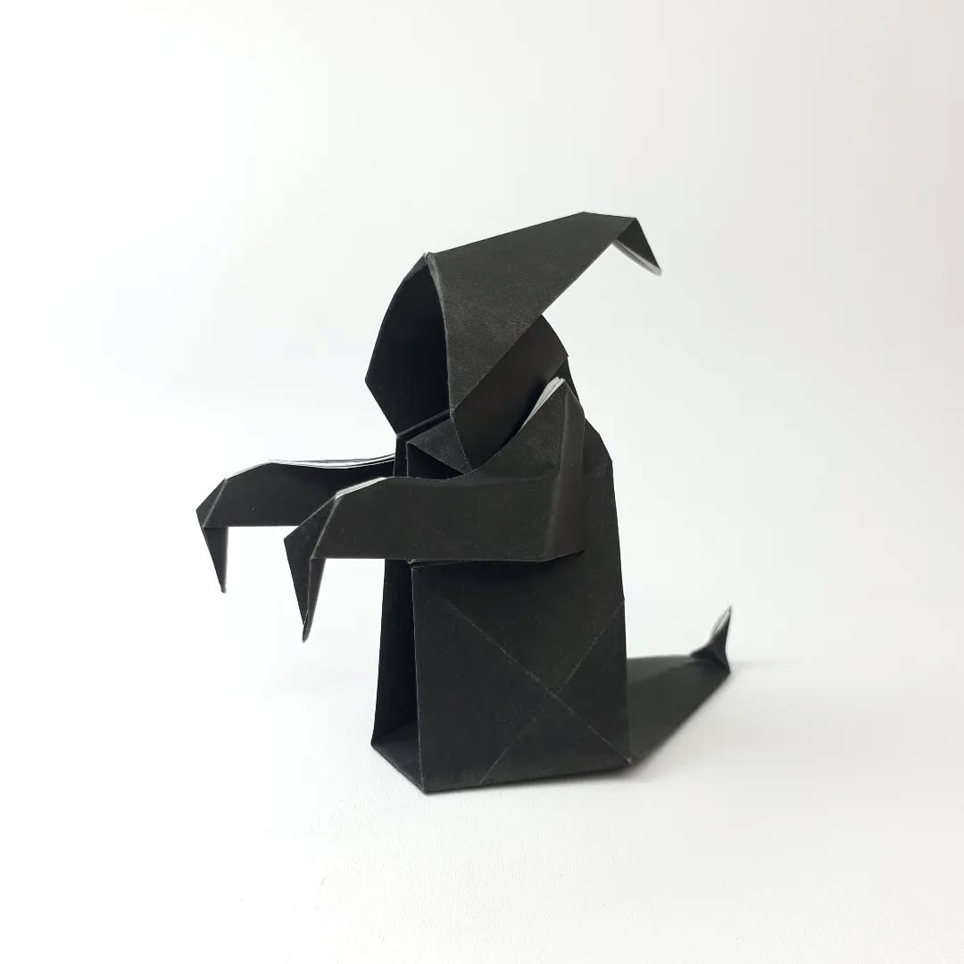 To make a paper ghost, start with a white square sheet of paper. First, fold the paper in half diagonally to form a triangle. Then, fold the triangle in half once more to create a smaller triangle. Next, unfold the last fold to reveal the centre crease. Fold the two top corners downwards towards the centre crease, giving the ghost a rounded head shape. For the bottom part, curve or trim the paper with scissors to create a wavy, floating effect. To add personality, draw two oval eyes and a small, round mouth using a black marker. You can make the ghost look spooky or silly depending on how you design the face. This simple paper ghost is perfect for Halloween decorations, fun crafts, or as part of a festive garland.