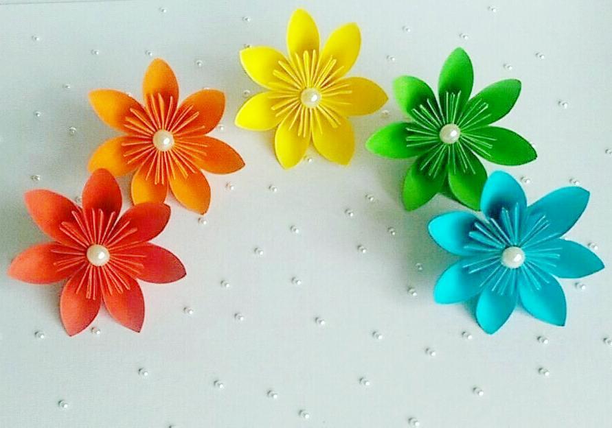 This is one of the simple origami crafts. Take bits and pieces of paper, fold them in the form of petals as shown, add one pearl in the middle and you are good to go.