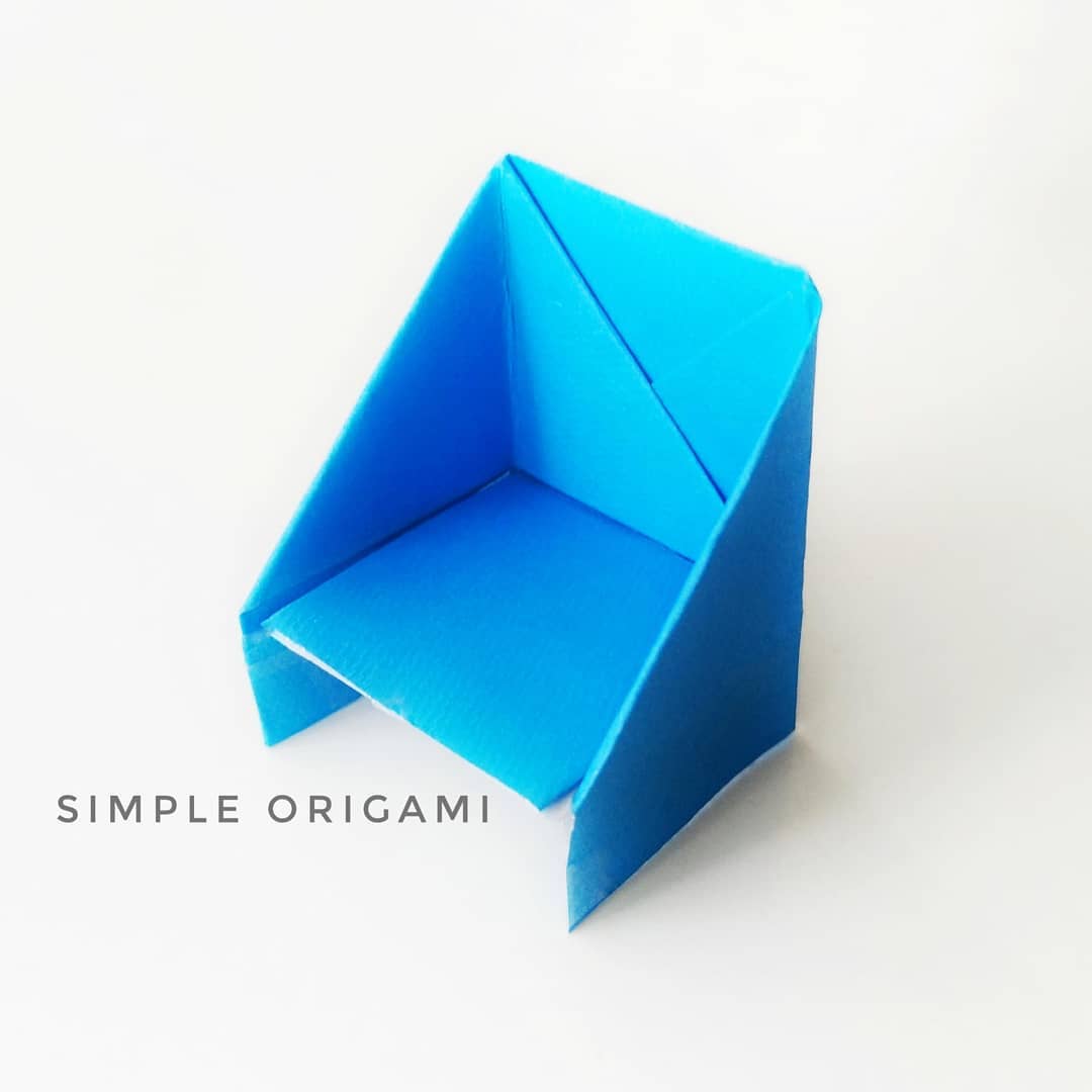 For this simple origami chair, fold a piece of paper in half, and then fold the corner edges from the centre which will give the shape of a triangle. Now fold again slightly to make two sides of a chair. Now attach a separate piece on the back and for the seat.