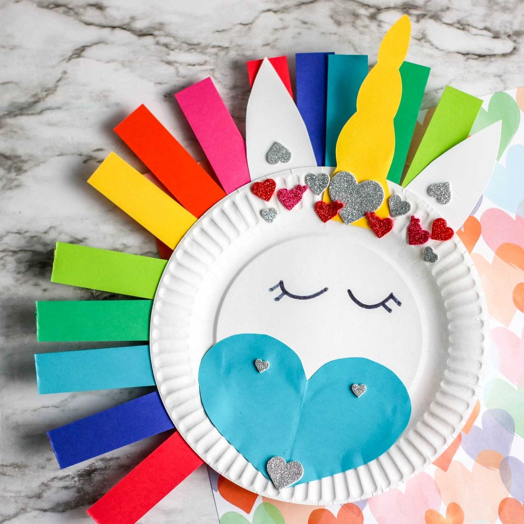 To make this colorful unicorn craft, start with a white paper plate as the base. Cut out strips of colored construction paper in rainbow colors and glue them around the top half of the plate to form the unicorn’s mane. Next, cut out a large yellow horn and two white ears with pink inner parts, then glue them above the plate. Cut a large blue heart and glue it at the bottom center of the plate to act as the unicorn’s nose and cheeks. Use a marker to draw closed eyes with lashes in the center of the plate. Finally, decorate the top with glittery heart stickers or foam shapes for extra sparkle. This fun and magical project is perfect for young kids and great for practicing color recognition and gluing skills.