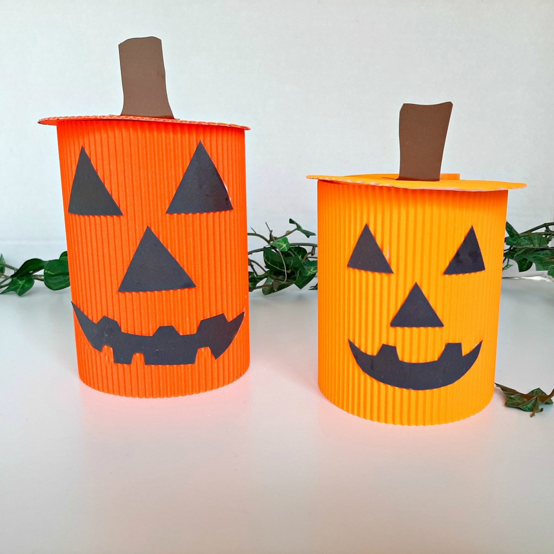 To create these adorable pumpkin crafts, start with two empty cups or small containers that have a ribbed texture, such as a disposable drink cup. Paint the entire surface orange to give the cup a pumpkin-like appearance. Next, cut out shapes from black construction paper to create the pumpkin’s face—triangular eyes, a triangular nose, and a jagged mouth. Carefully glue these pieces onto the front of the cup to form the spooky jack-o’-lantern face. For the stem, cut a small rectangle from brown paper and glue it to the top of the cup, making it look like the pumpkin’s stem. Once everything is dry, you can add decorative elements like green vines or leaves to complete the look. This simple craft is a great way to celebrate Halloween!