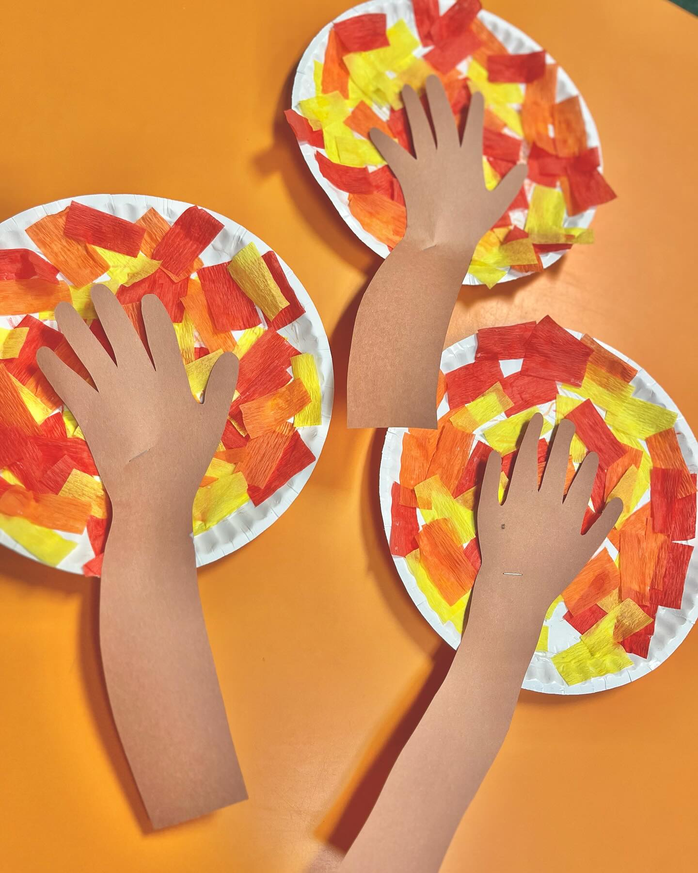 To make this fun and festive autumn craft, start with a white paper plate and cover the center with small pieces of red, orange, and yellow tissue or crepe paper to mimic fall leaves—glue them down randomly to create a colorful, leafy texture. Next, trace a child’s hand and forearm on a sheet of brown construction paper and cut it out. Glue the hand cutout onto the center of the paper plate so it looks like it’s reaching into the leaves. This project is great for celebrating the fall season, and it also helps young kids practice cutting, gluing, and fine motor skills.