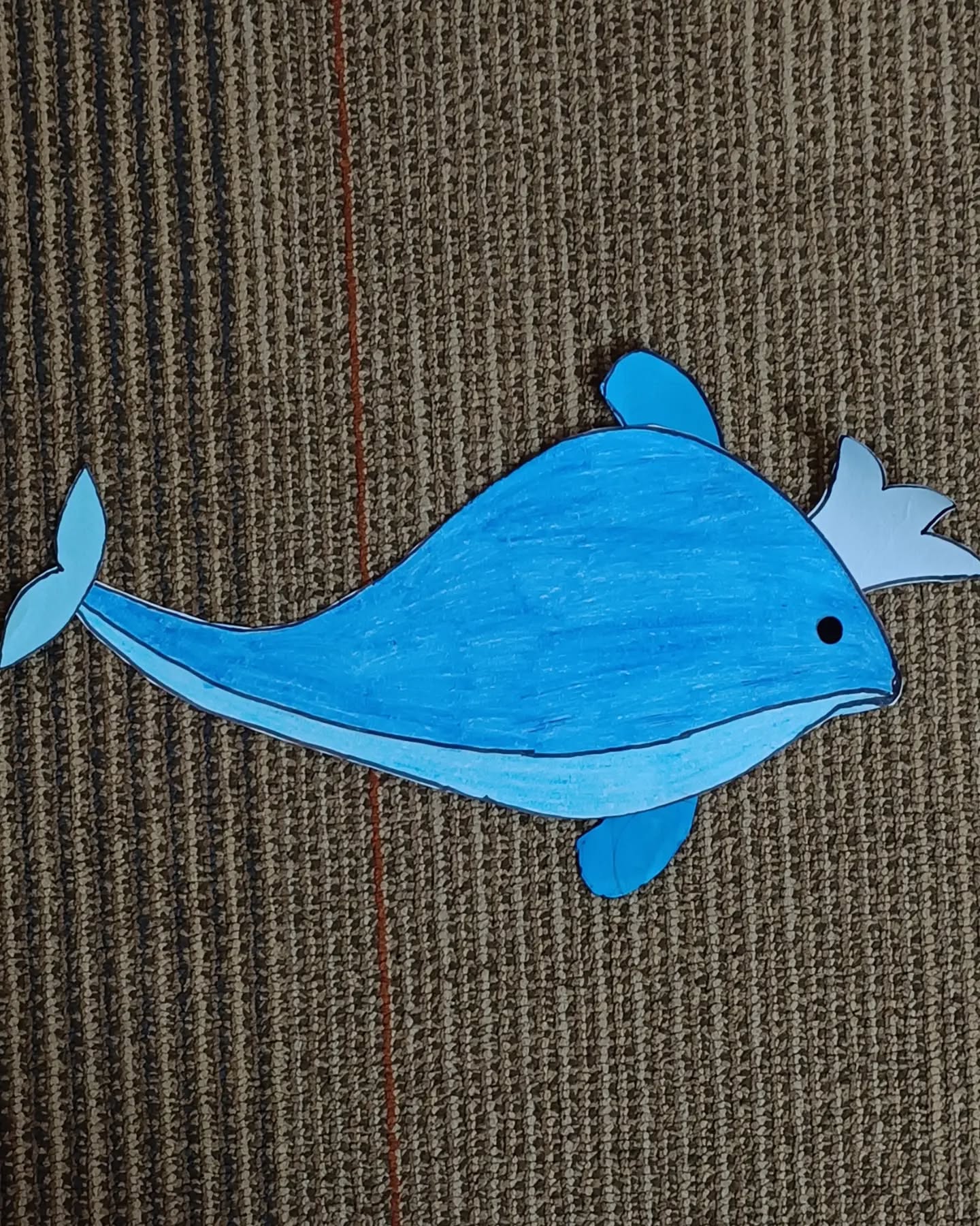 To make this whale draw a whale with pencil and colour it with wax crayons.