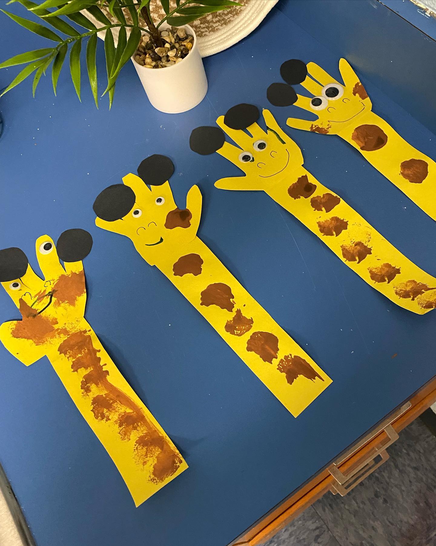 To make these fun handprint giraffe crafts, start by tracing your hand on yellow construction paper and cutting it out—this will form the giraffe’s head and ossicones (horns). Then, cut a long rectangular strip from the same yellow paper to create the giraffe’s neck and glue it to the bottom of the handprint. Use brown paint or markers to add spots along the neck to mimic a giraffe’s pattern. Glue black or brown paper circles to the tops of the “fingers” to represent the ossicones. Add googly eyes to the face area and draw a smile and nostrils with a black marker. Once everything is dry, your adorable handprint giraffe is ready to be displayed! This is a great craft for preschoolers learning about animals.