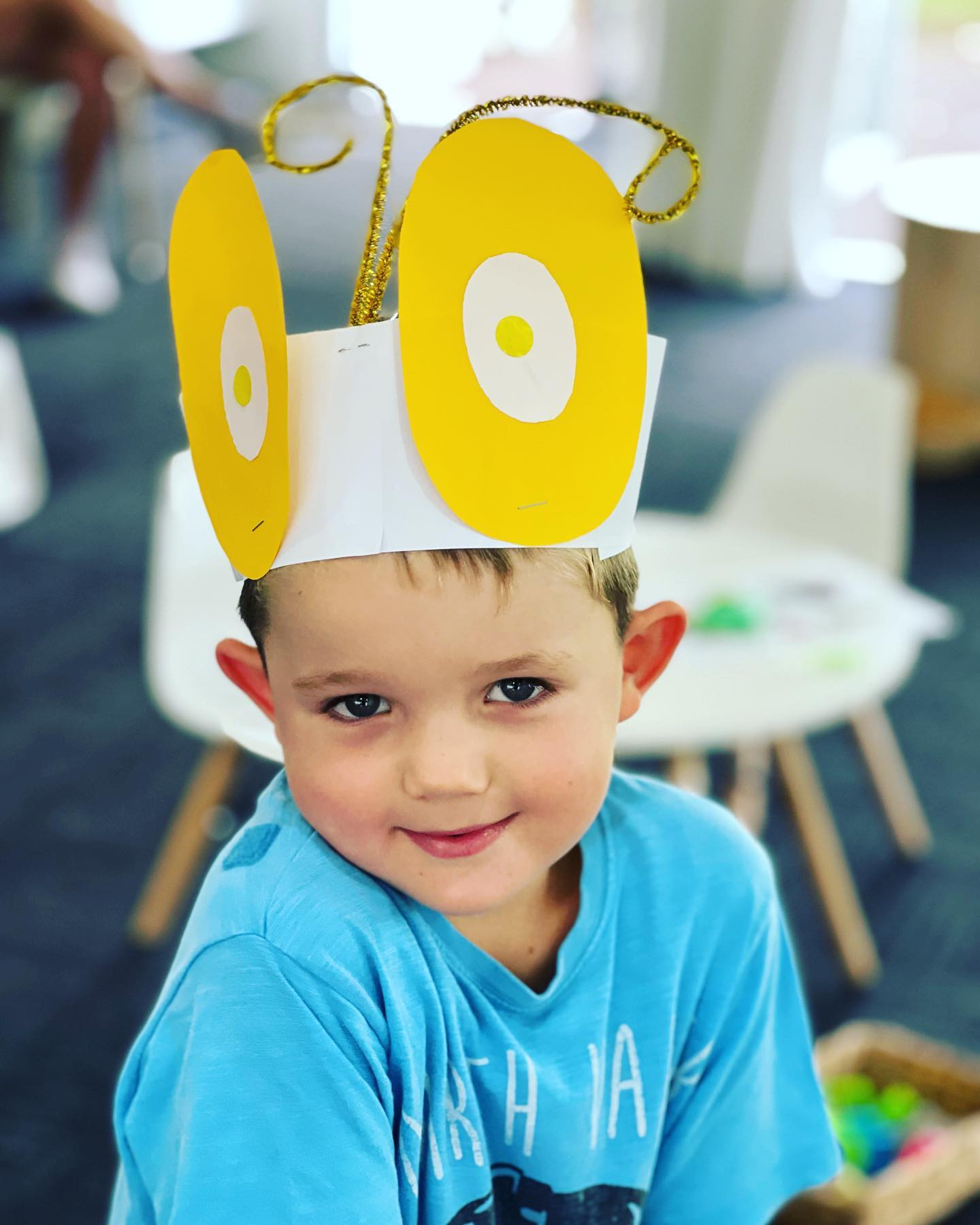 To make this adorable butterfly or bug headband, start by cutting a long strip of white cardstock or construction paper to fit around the child’s head and tape or staple it into a circle. Cut out two large yellow ovals for the eyes, then glue smaller white circles and tiny yellow dots in the center to complete the eyes. Attach these eyes to the front of the headband. For the antennae, twist two gold pipe cleaners into spiral shapes and secure them to the inside of the headband using tape or glue. Let the child wear their fun buggy headband and enjoy imaginative play!