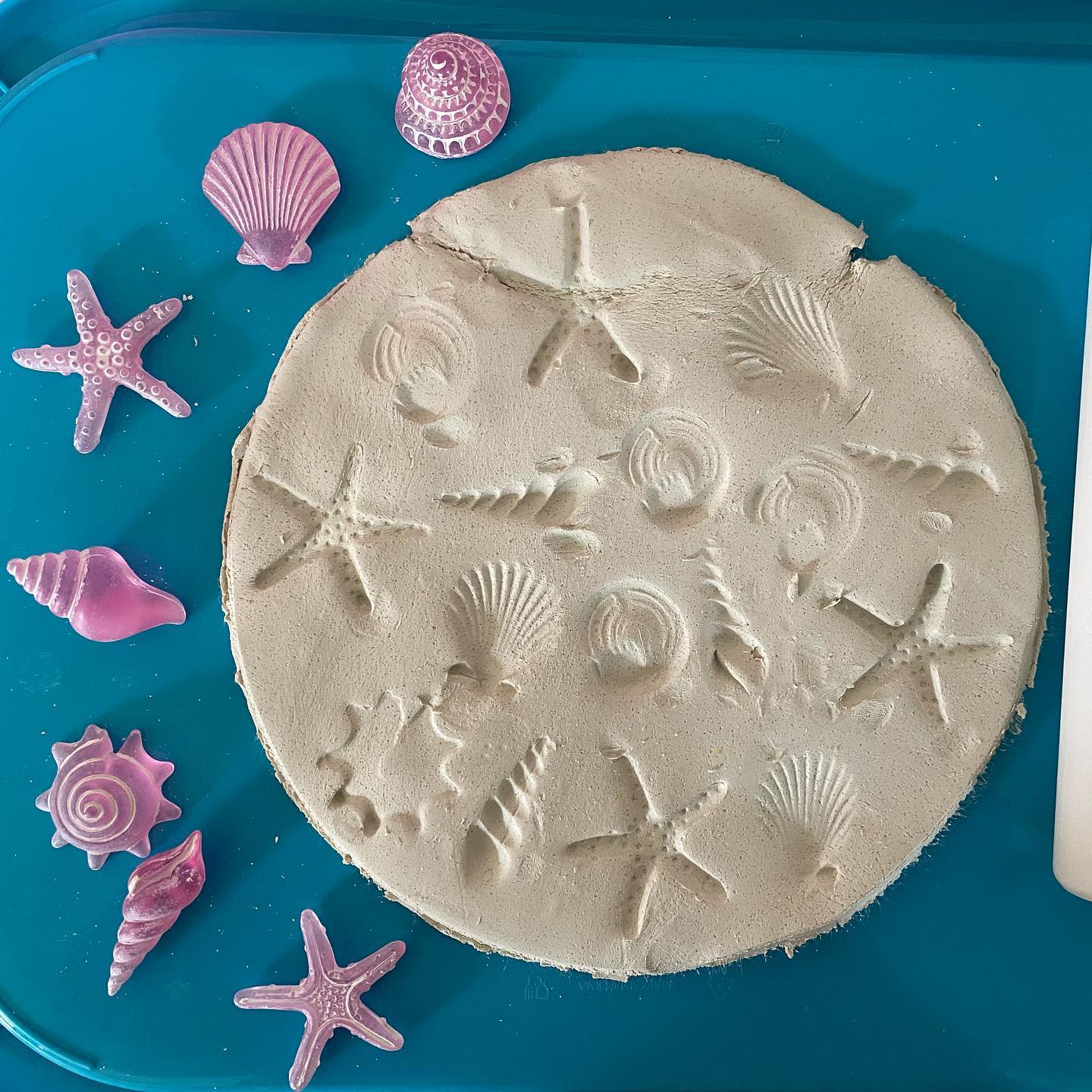 To make this fun seashell impression craft, start by rolling out a ball of air-dry clay or homemade salt dough into a flat, round disc about 1/2 inch thick. Gather a variety of small plastic sea creatures or shells, like starfish, conch shells, and scallops. Gently press each item into the clay to make a clear impression, then carefully lift them off. Once you’re happy with the pattern, let the clay dry completely according to the package instructions (or air-dry overnight if using salt dough). This creates a beautiful fossil-like beach-themed artwork perfect for summer activities or ocean-themed lessons!