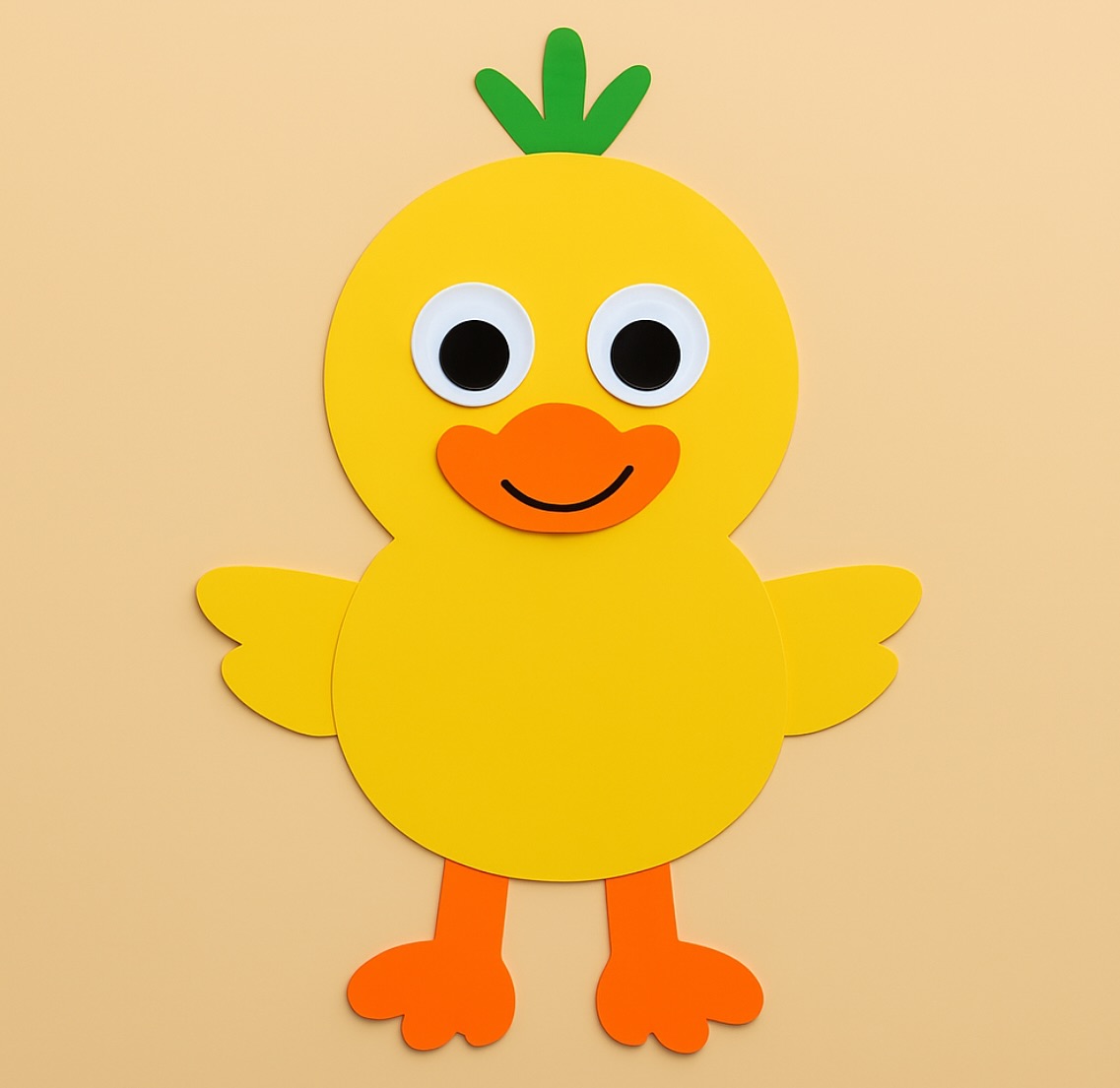 To make this cute duck craft, start by cutting out large shapes from colorful foam sheets. For the body, cut a large circle from yellow foam, and for the wings, cut two smaller oval shapes. Next, cut out a small orange shape for the beak and glue it to the middle of the circle. For the feet, cut out two shapes that resemble webbed feet from orange foam and glue them at the bottom of the circle. Use two large black-and-white googly eyes or cut out two big circles from white foam and smaller black circles for the pupils, then attach them to the head. Cut a small green piece of foam into a leaf shape and glue it to the top of the duck’s head for a little tuft of feathers.