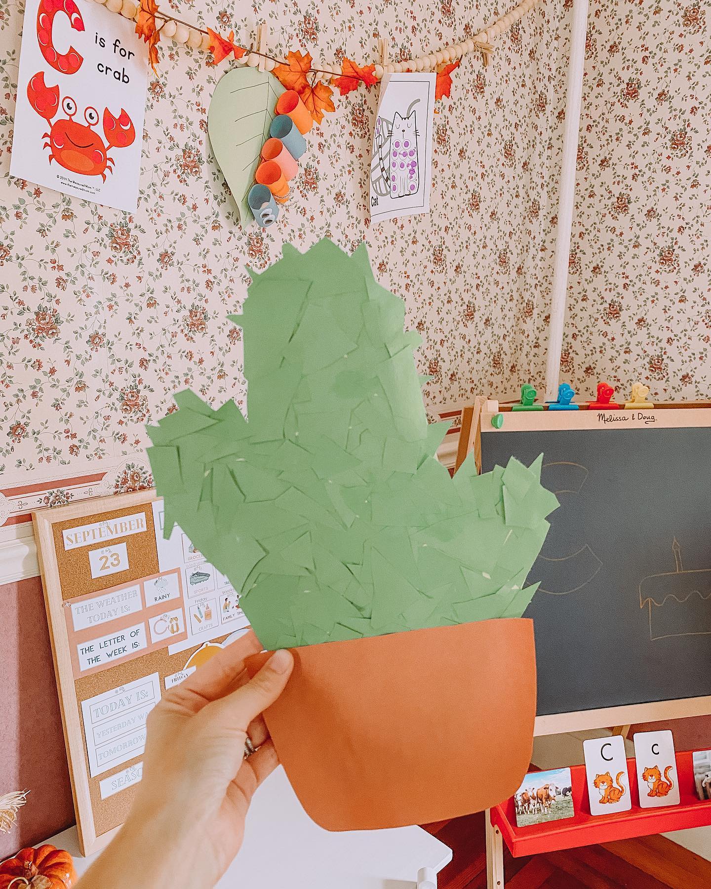 To make this adorable cactus craft, start by cutting a large cactus shape from green construction paper. Then, tear or cut small pieces of green paper to create the “spikes” and texture of the cactus, and glue them all over the cactus shape for a layered effect. Next, cut out a pot shape from brown or orange construction paper and glue it to the bottom of the cactus to complete the potted look. You can mount the whole craft on a larger sheet or leave it as-is for a cute classroom decoration. This simple and tactile activity is great for practicing scissor skills and fine motor coordination.
