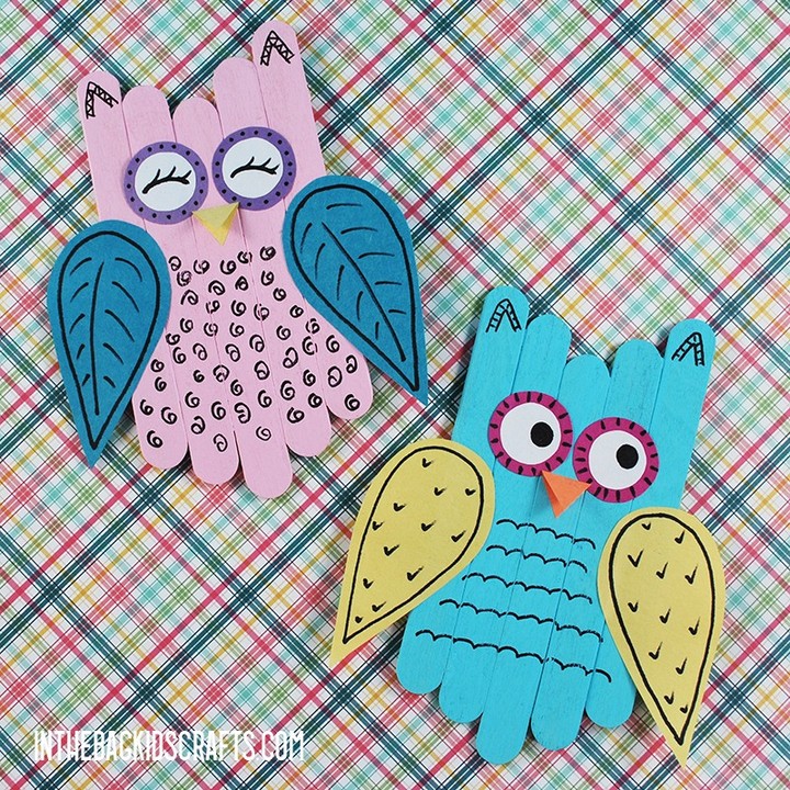 To make these colorful owl crafts, start by gluing five popsicle sticks side by side to form the owl’s body. Once the glue is dry, paint the sticks in bright colors like pink or blue. For the wings, cut out two leaf-shaped pieces from colored paper and draw feather details with a black marker. Glue the wings onto the sides of the popsicle stick body. Cut two large circles from white paper for the eyes, add smaller black circles for the pupils, and glue them on. For added detail, you can cut colored rings to go around the eyes. Use orange paper to make a small triangle beak and glue it between the eyes. Finally, use a marker to draw patterns like feathers or eyebrows on the owl’s body and head. Once everything is dry, your cheerful popsicle stick owls are ready to display!