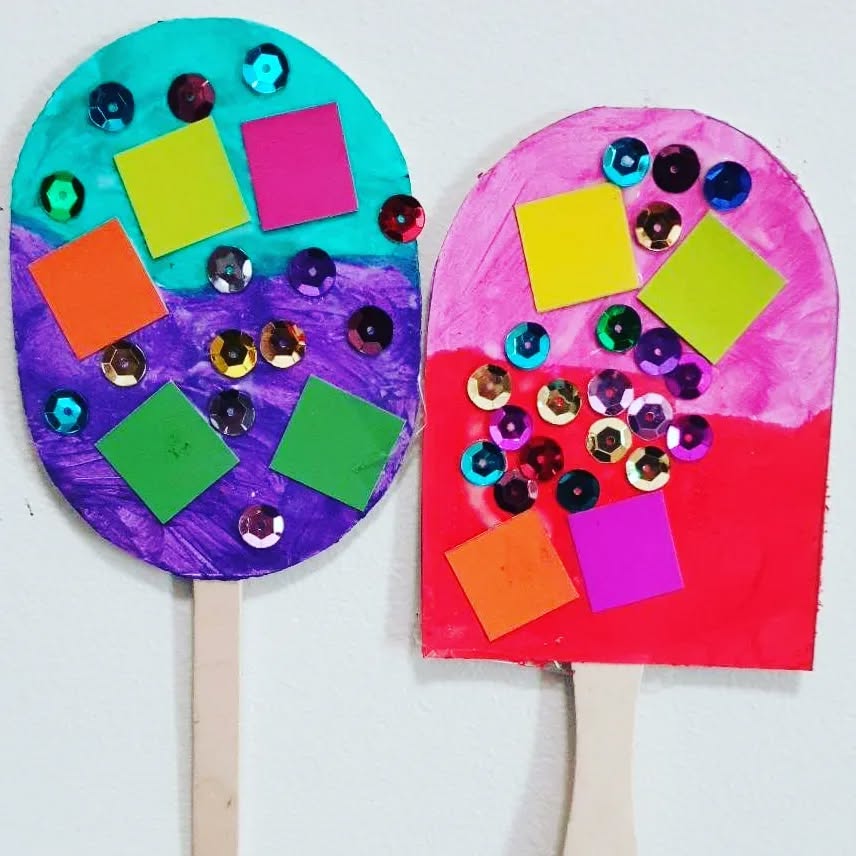 To make this colorful popsicle craft, start by cutting popsicle shapes out of sturdy cardboard or thick paper. Have kids paint the popsicle shapes in two-tone colors using washable paints, letting them dry before the next step. Once dry, provide a variety of foam squares and sequins for decoration. Kids can glue the foam squares and sequins onto the popsicle shapes to create fun and sparkly designs. Finally, attach a wooden craft stick to the bottom of each popsicle using glue or tape to act as the handle. This craft is a bright and easy summer-themed activity perfect for young children.