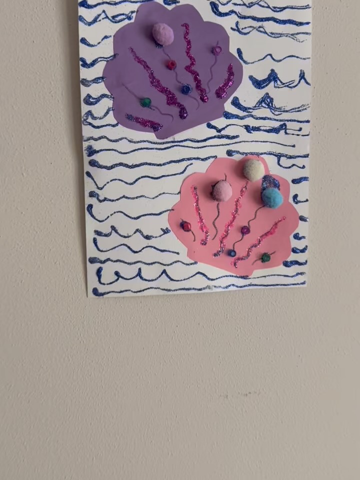 To make this under-the-sea shell craft, start with a piece of white cardstock as your background. Use a blue marker, crayon, or glitter glue to draw wavy ocean lines across the page. Next, cut out shell shapes from colored construction paper, like pink and purple, and glue them onto the background. Decorate the shells by drawing or gluing squiggly lines with glitter glue to represent the inside patterns. Add small pom-poms or beads to look like pearls or sea treasures. Let everything dry completely before displaying your sparkly sea scene!
