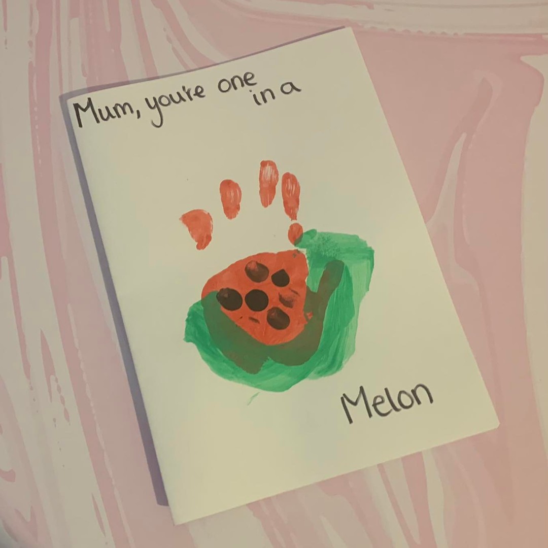 To make this adorable “Mum, you’re one in a melon” card, start with a blank piece of white cardstock folded in half to create your card base. Paint the palm of your child’s hand with red paint, the base of the palm with green (for the rind), and add a thin line of dark green along the edge for depth. Carefully press the painted hand onto the front of the card to form a watermelon shape. Once the handprint is dry, use black paint or a marker to add dots for seeds. Finally, write the sweet message “Mum, you’re one in a melon” above and below the handprint. This makes a perfect keepsake for Mother’s Day or any special occasion!