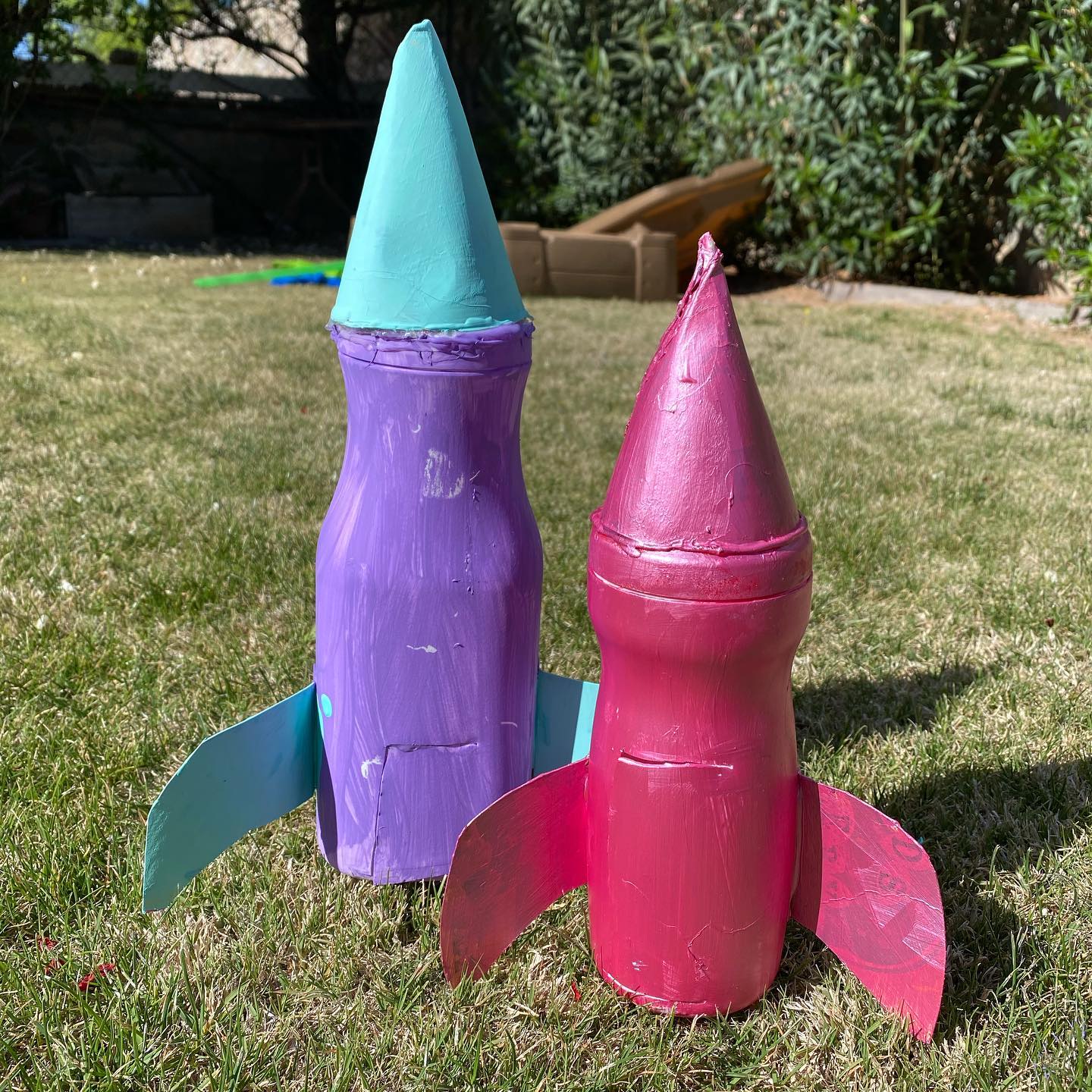 To make these fun rocket-shaped crafts, start by collecting some empty plastic bottles. You’ll need two bottles, one for each rocket. Begin by painting the bottles with bright colors like purple and pink, covering the whole surface to give them a solid, vibrant look. For the rocket’s nose, take a piece of cardboard or thick paper and cut it into a cone shape, then paint it in a complementary color, like turquoise, and attach it to the top of the bottle with glue. Next, create the rocket fins using cardboard or thick paper; cut them into a triangular shape and paint them. Attach the fins to the bottom of the bottle, spacing them evenly. Once the paint is dry, you can add any extra touches, such as stars or dots, to give your rocket a more personal and decorative feel.