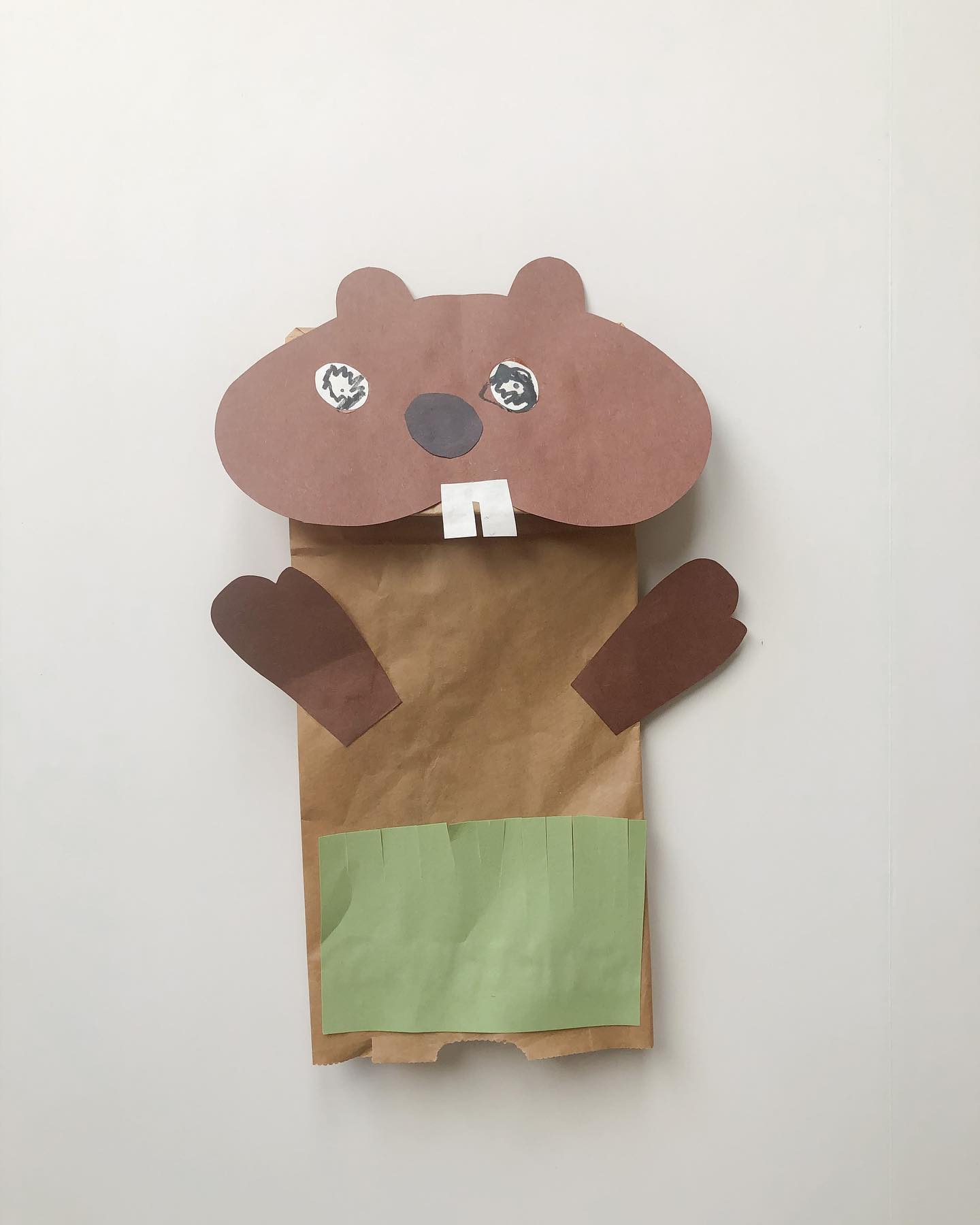 To make this adorable beaver craft, start by using a brown paper lunch bag for the body. Lay the bag flat and then cut out a large round shape from brown construction paper for the beaver’s head. Attach it to the top of the bag with glue. For the ears, cut two small ovals from brown paper and glue them on either side of the head. Next, cut out two white teeth from paper and glue them at the bottom of the head. For the eyes, use white paper for the whites and black paper for the pupils, or use googly eyes. For the beaver’s arms, cut out two smaller brown shapes and glue them to the sides of the bag. For the base, cut strips of green paper to create a grass-like effect and glue them at the bottom of the bag.