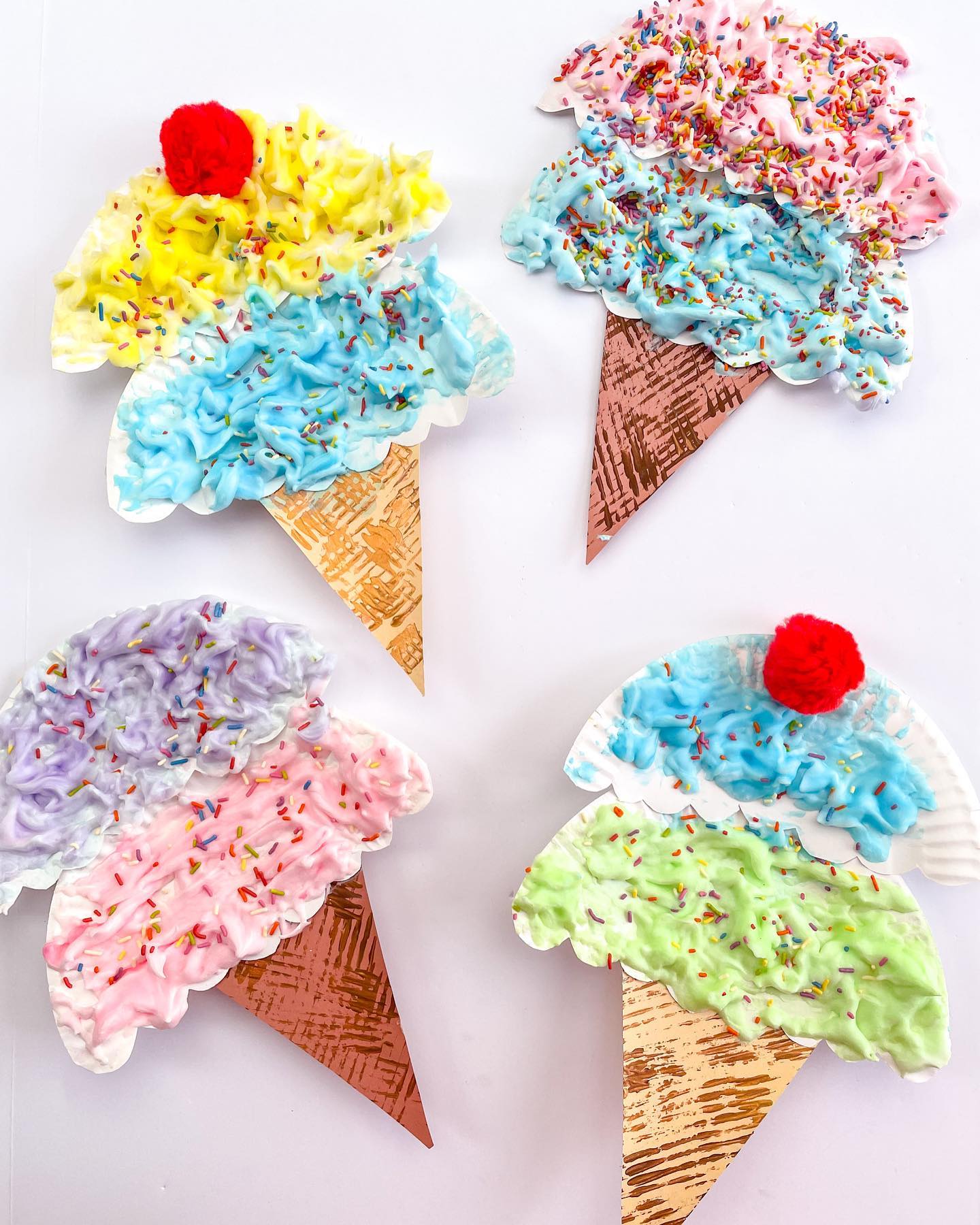 To make these fun and colorful ice cream cone crafts, start by cutting a large triangle from brown construction paper to create the cone. For the ice cream scoops, take paper plates and cut them in half, then use a pair of scissors to trim the edges to create a wavy, scoop-like shape. Paint the paper plate halves in bright ice cream colors like pink, blue, yellow, purple, or green. Once the paint has dried, glue them to the top of the cone shape, stacking the scoops on top of each other. To add texture and make the scoops look more realistic, glue cotton balls or white tissue paper onto the painted areas. Finish by decorating with colorful sprinkles (use actual sprinkles or cut small pieces of colored paper) and adding a red pom-pom at the top to represent a cherry. Let everything dry, and you’ll have an adorable set of ice cream cone crafts to enjoy!