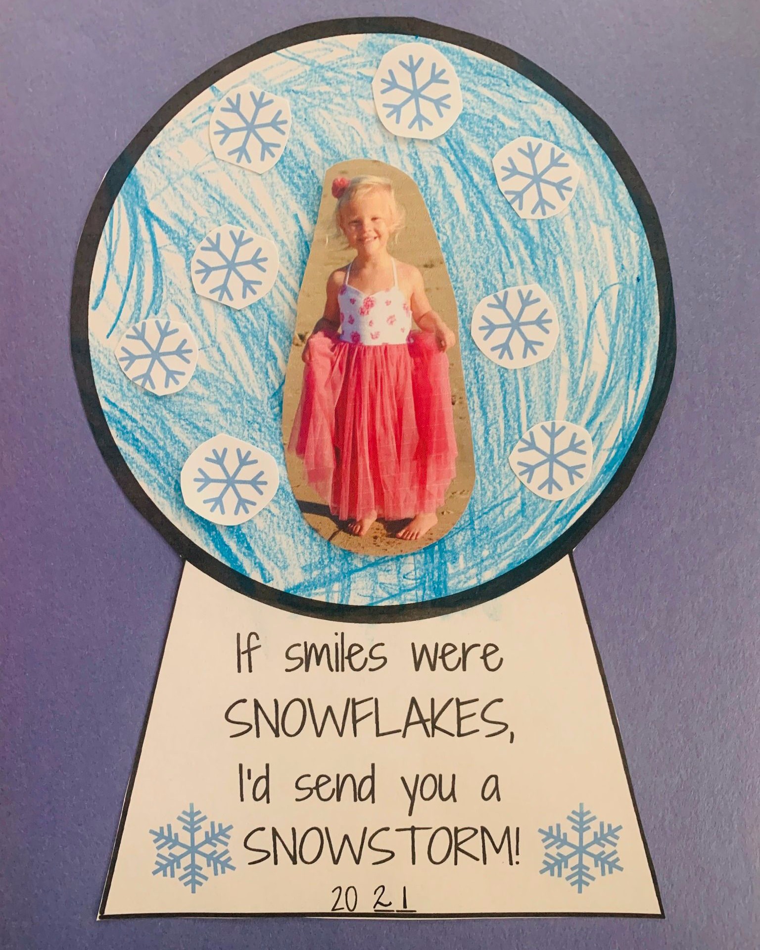 To make this adorable snow globe craft, begin by cutting out a circle from white paper for the globe and a trapezoid shape from white paper for the base. Have your child color the globe background with blue crayon or marker to create a wintry scene. Print and cut out a small photo of the child and glue it in the center of the globe. Next, cut out or print small snowflake shapes and glue them around the photo inside the globe. Add a year at the bottom, then glue the globe and base together onto a piece of construction paper. This makes a perfect keepsake or holiday gift!