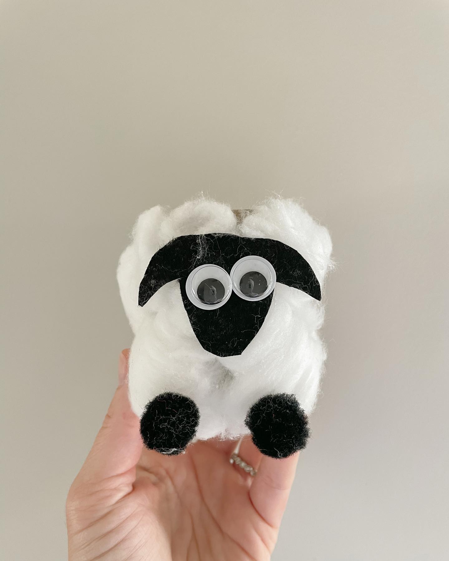 To make this adorable sheep craft, start with a small cardboard tube as the base. Cover the entire tube by gluing on fluffy white cotton balls to create the sheep’s wool. For the face, cut a sheep head shape from black felt or construction paper and glue it onto the front. Add two googly eyes to the face to give it a fun, animated expression. For the feet, glue on two small black pom-poms at the bottom of the tube. Let everything dry completely before handling. This simple and cute craft is perfect for a farm animal theme and fun for kids of all ages!